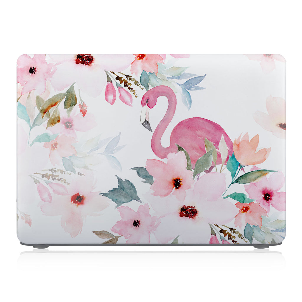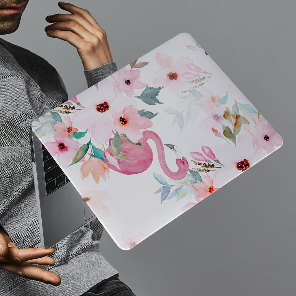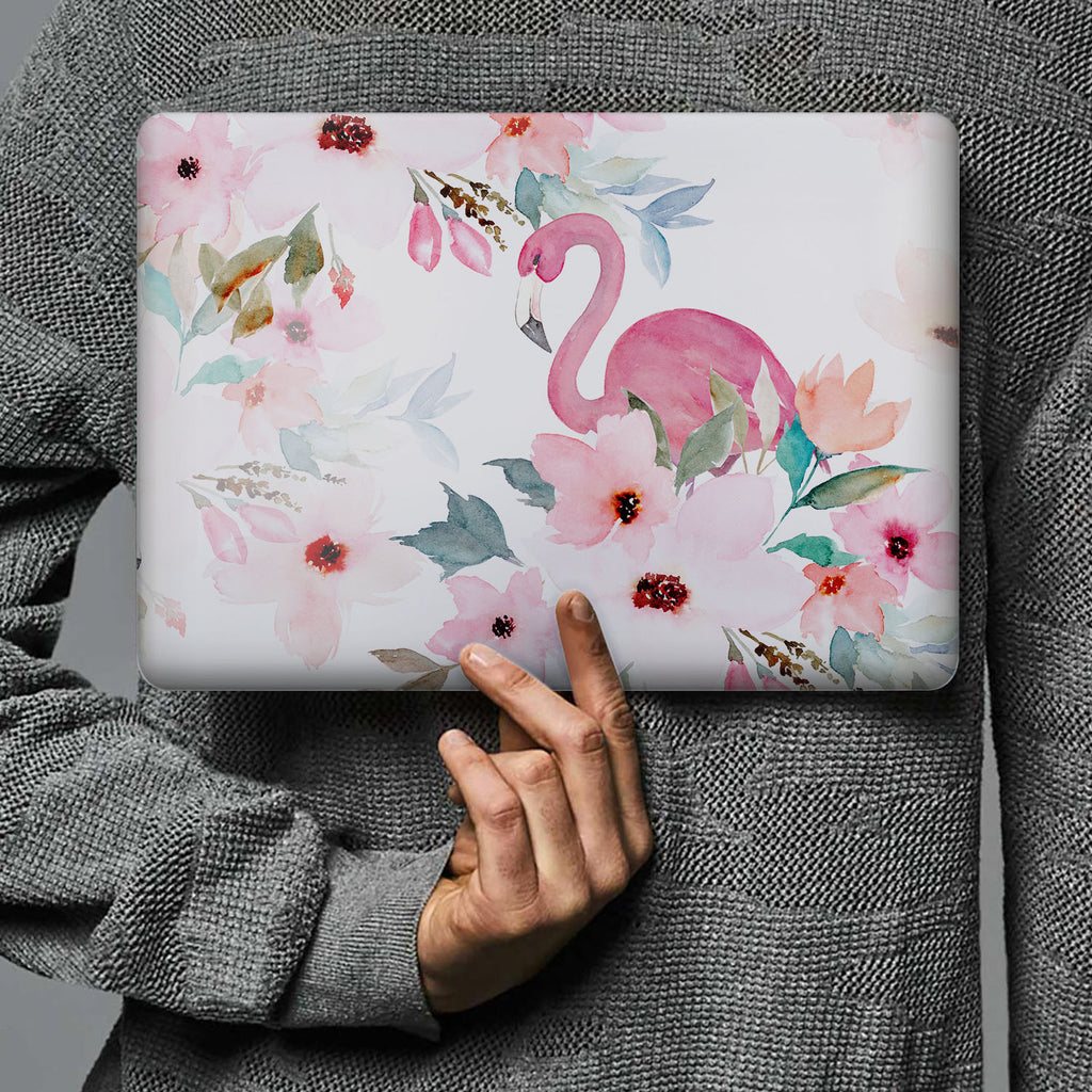 " A graceful pink flamingo hides coyly among big beautiful blooms on this tropical Macbook Case. It's a feminine design filled with soft pastel colors and characterized by a unique watercolor painting style. With this print in your life, you'll be whisked away to your island paradise... if only in your dreams! "